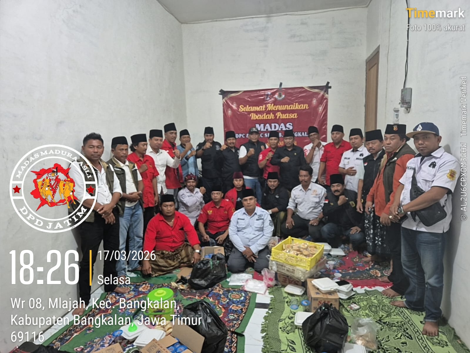 Bangkalan, ( Lenterapoat.id ) Jawa Timur — Suasana penuh kebersamaan dan kekhidmatan mewarnai kegiatan buka puasa bersama yang diselenggarakan oleh keluarga besar MADAS (Madura Asli Daerah Anak Serumpun) DPC dan DPAC se-Kab. Bangkalan di Kantor DPC BANGKALAN Perumahan Permata, Kelurahan Mlajah, Kecamatan Bangkalan, Kabupaten Bangkalan, Jawa Timur. Selasa, Sore (17/03/2026). Kegiatan ini dirangkaikan dengan doa bersama dan tahlil dalam rangka memperingati 1 tahun wafatnya almarhum Ketua Umum, H. Berlian Marzuki. Momentum tersebut menjadi ajang silaturahmi sekaligus refleksi untuk mengenang jasa dan perjuangan beliau dalam membesarkan organisasi MADAS (Madura Asli Daerah Anak Serumpun).Sebelum pelaksanaan buka bersama, MADAS ( Madura Asli Daerah Anak Serumpun ) juga menggelar aksi sosial berupa pembagian 1.000 paket takjil kepada masyarakat dan para pengguna jalan. Kegiatan berbagi takjil tersebut dilaksanakan di depan Kantor Kejaksaan Negeri Bangkalan, sebagai bentuk kepedulian sosial di bulan suci Ramadan.Acara ini dihadiri oleh kurang lebih 300 peserta dari berbagai unsur kepengurusan MADAS (Madura Asli Daerah Anak Serumpun ) Turut hadir perwakilan DPP MADAS ( Madura Asli Daerah Anak Serumpun ) Bpk. SUBHAN, Ketua MADAS ( Madura Asli Daerah Anak Serumpun ) DPD Jawa Timur, R. Zainal Fatah beserta jajaran pengurus, Ketua DPC Surabaya Rahmad Tullah beserta jajaran, Ketua DPAC Camplong, Ketua DPAC Asemrowo, Ketua DPAC Blega, Ketua DPAC labeng beserta seluruh jajaran masing-masing. Selain itu, hadir pula Panglima DPD Jatim Abah Duro bersama jajaran pengurus DPD Jawa Timur, serta beberapa para pengurus dan anggota DPC dan DPAC se-Jawa Timur.Dalam sambutannya, Ketua MADAS DPC Bangkalan Hj. Usman menyampaikan, “Alhamdulillah, puji syukur ke hadirat Allah SWT, atas terselenggaranya kegiatan buka bersama, berbagi takjil, serta doa dan tahlil untuk mengenang 1 tahun almarhum Bapak H. Berlian Marzuki.