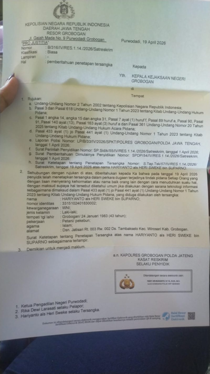 “Benar kami telah menerima pemberitahuan tentang penetapan tersangka Heri Sweke melalui surat yang dikirim oleh Satreskrim Polres Grobogan. Dan saya rasa penetapan tersangka Heri Sweke ini sangatlah layak karena dari alat bukti, keterangan saksi-saksi semua mendukung,” ujar Minarno Tirta, S.H, M.H. Senin (20/04/2026).
