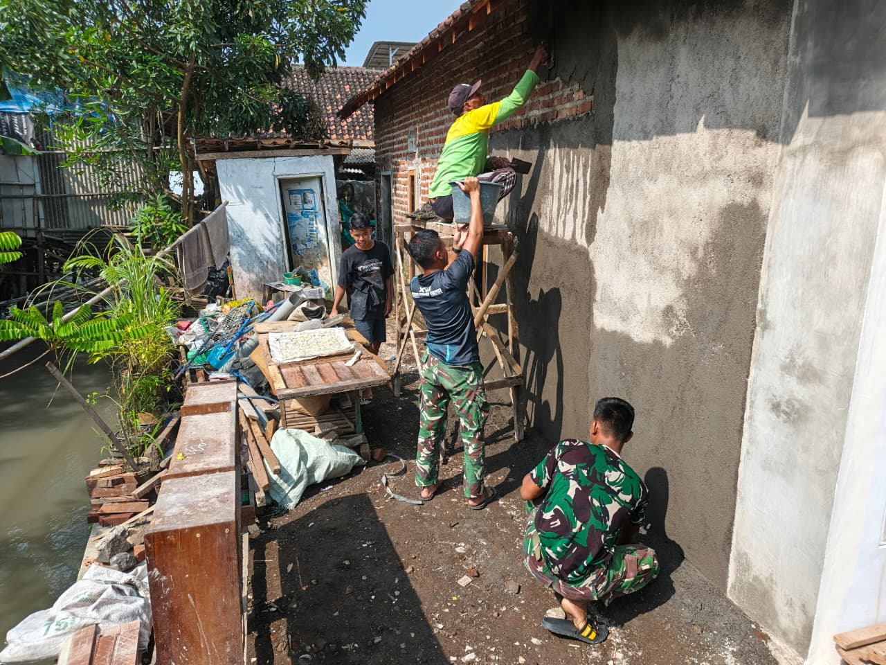 Prajurit TNI dan warga bekerja sama di atas perancah kayu, mengaduk semen dan meratakan plaster pada dinding bata. Perlahan, dinding rumah tampak semakin rapi dan kokoh, menjadi tanda kemajuan pembangunan rumah tersebut.
