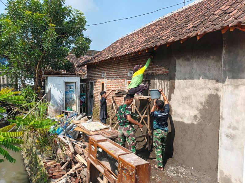 Semangat gotong royong terlihat saat anggota Satgas TNI Manunggal Membangun Desa (TMMD) Ke-127 Kodim 0819/Pasuruan bersama warga menyelesaikan tahap finishing rehabilitasi Rumah Tidak Layak Huni (RTLH) milik Ibu Aisyah di Dusun Ngepreng, Desa Wonosari, Kecamatan Gondangwetan, Kabupaten Pasuruan, Senin (9/3/2026).
