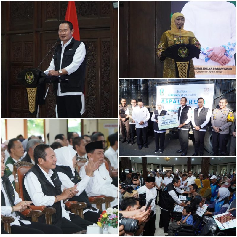 Tidak hanya itu, Bu Khofifah juga menyerahkan bantuan program pembinaan jalan kabupaten berupa 300 drum aspal. “Jadi kita sering mendapat laporan jalan rusak, apalagi karena musim hujan. Ini sistemnya kita sharing Pak Bupati, jadi kami bahannya nanti dari kabupaten tenaganya. Terima kasih, semoga semuanya ini dapat memberi manfaat” ungkapnya.