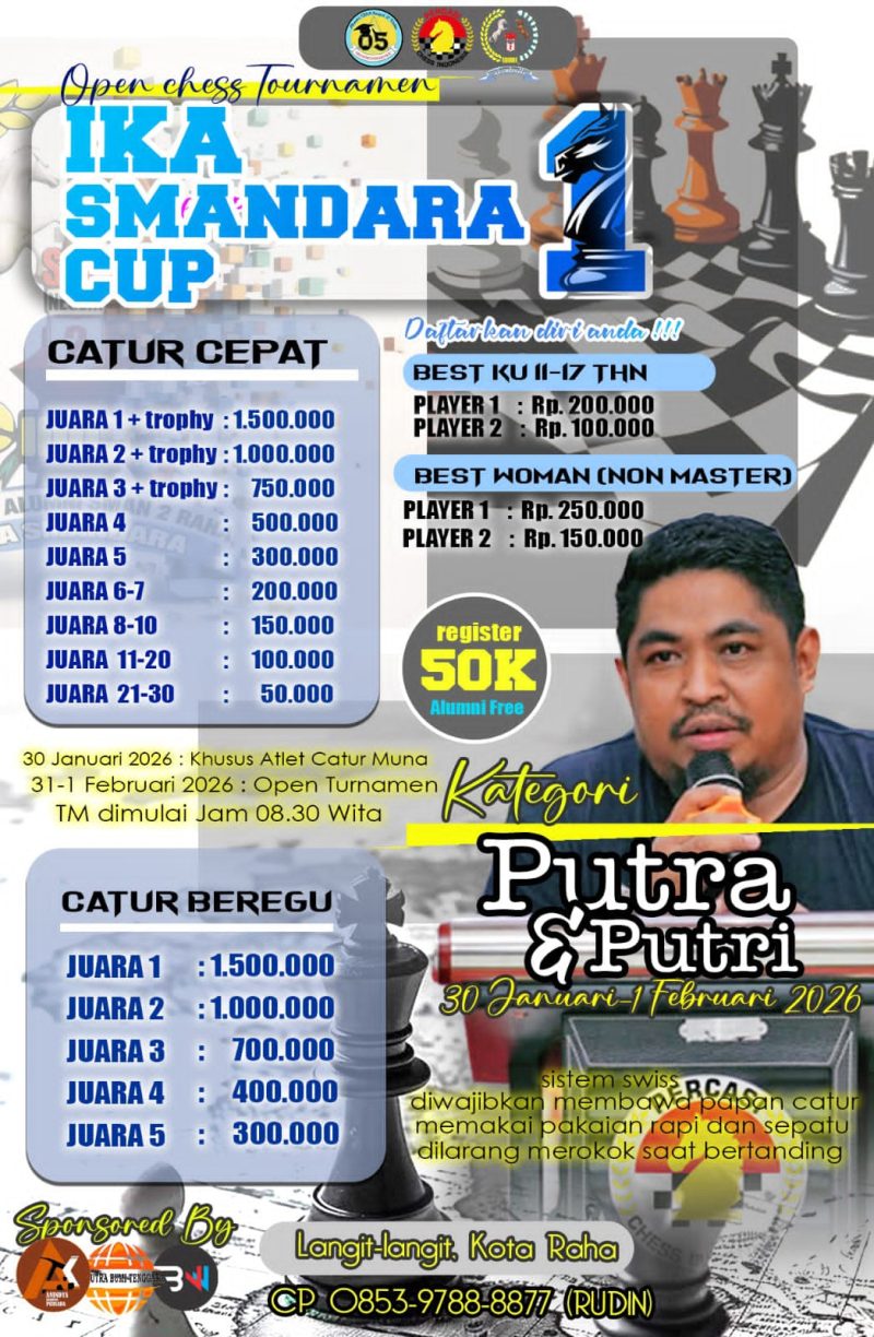 MUNA — 29 januari 2026 – Penantian panjang para pecatur berbakat di Kabupaten Muna akhirnya berakhir. Besok, Jumat, 30 Januari 2026, Seleksi Catur Kabupaten Muna resmi digelar dan menjadi ajang penting untuk menjaring atlet-atlet terbaik yang akan dipersiapkan mewakili daerah pada Pekan Olahraga Provinsi (Porprov) Sulawesi Tenggara.