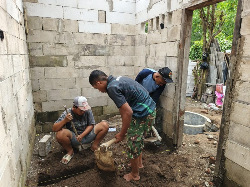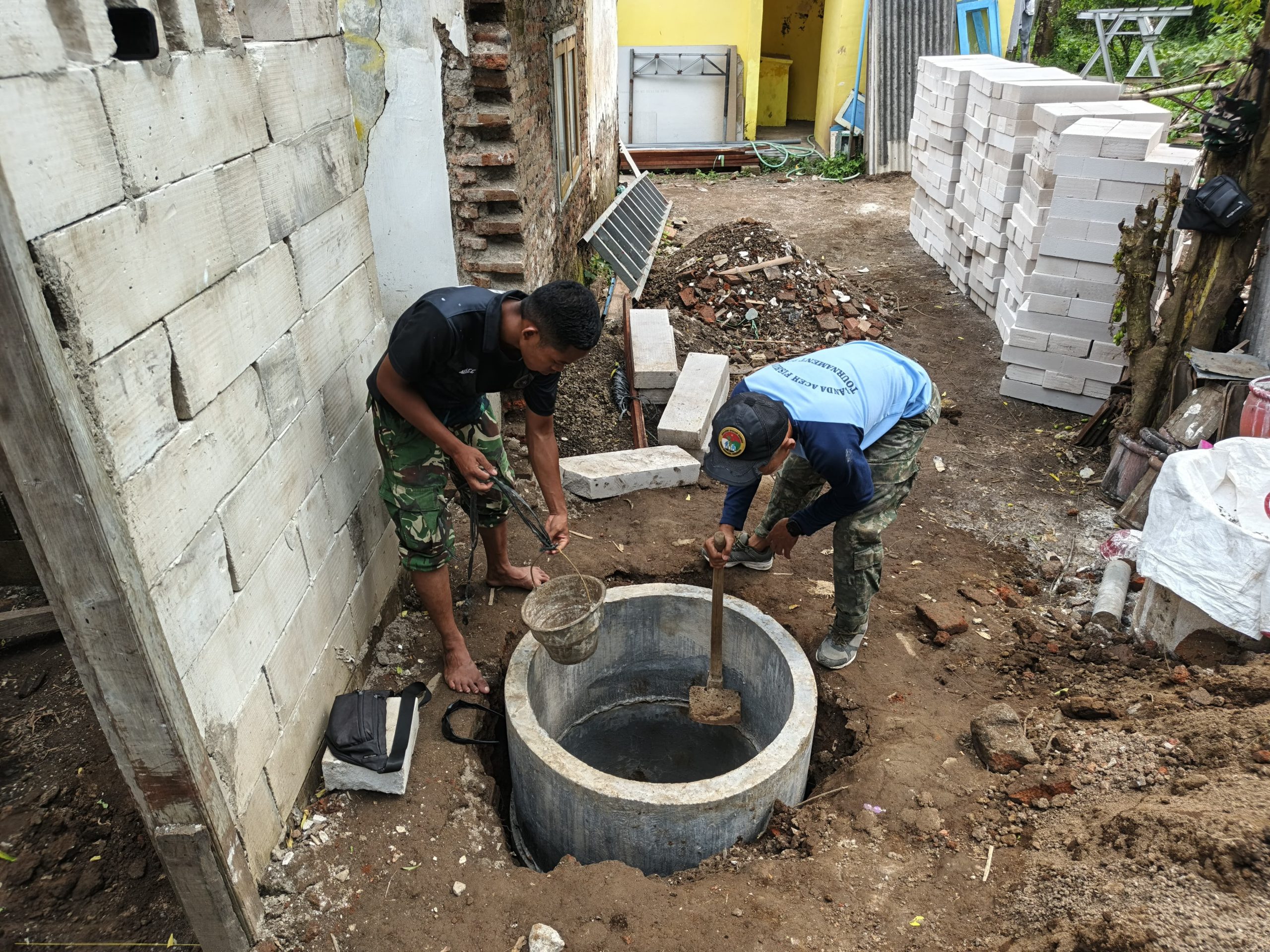 Di lokasi pembangunan, dua prajurit TNI terlihat bekerja di sekitar sumur beton. Seorang prajurit menuangkan air dari selang ke ember, sementara rekannya meratakan adukan semen di dasar lubang menggunakan cangkul. Tumpukan batu bata yang siap dipasang menjadi tanda bahwa pembangunan fasilitas sanitasi tersebut terus berjalan.